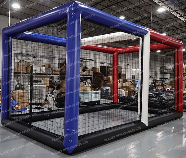 Verpackung Informationen: Schwarzer aufblasbarer Schlagkäfig in einer PVC-Planentasche und Pumpe im Karton
